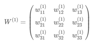 For example, the connection between the first node of layer 1 and the second node of the layer 2 is $w_{21}^{(1)}$